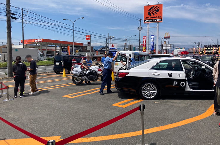北上警察署と協力し開催。パトカーと白バイの乗車体験、さらに交通安全協会の協力を得て俊敏性テストを実施しました。